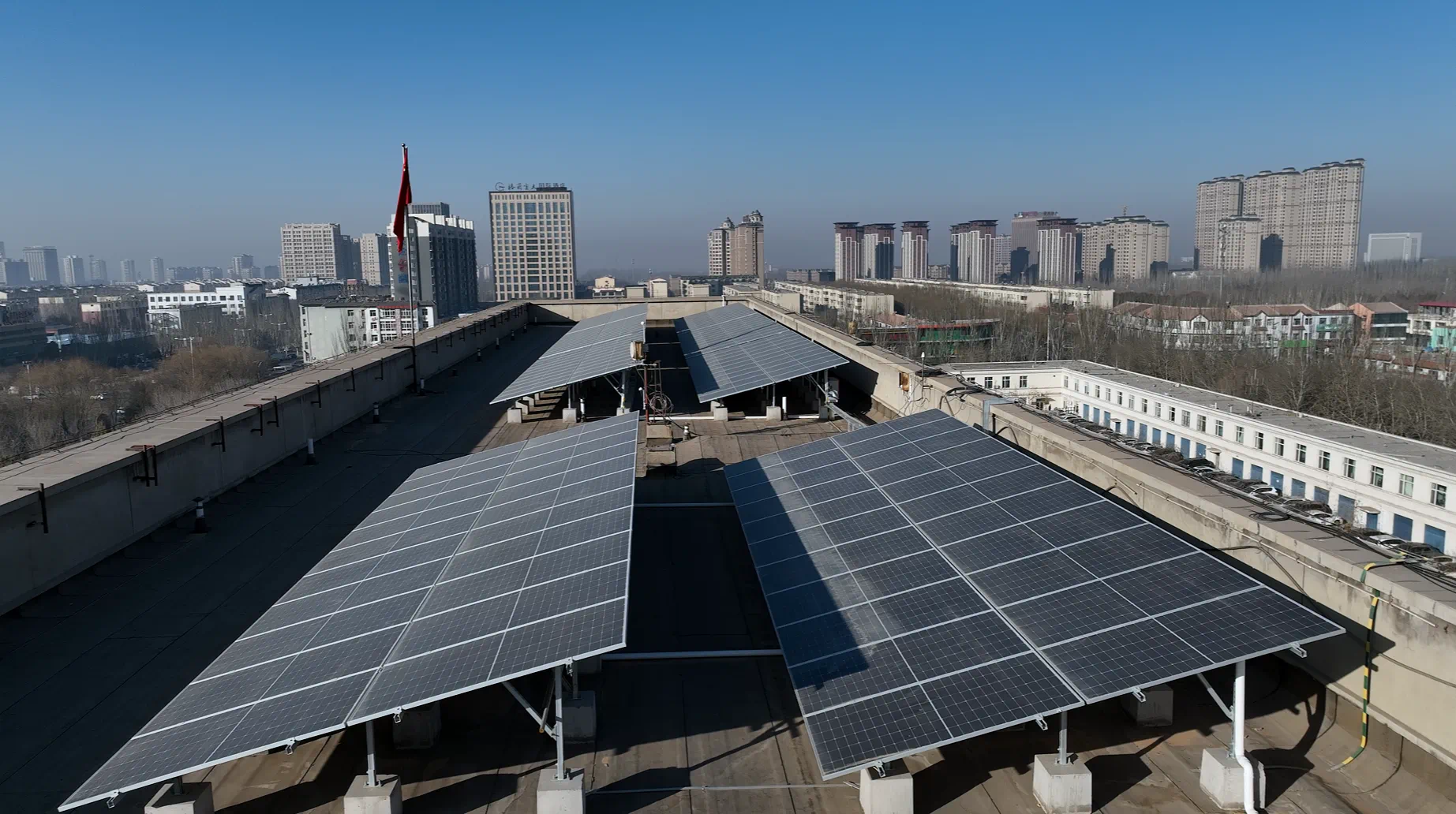 在海勃湾区党政大楼楼顶,一片片光伏板排列整齐,将太阳能尽数“捕捉”转化为电能,为楼内输送源源不断的绿色能源,据了解,这片总占地面积约1319平方米的分布式光伏项目,可“因地制宜”将光伏可建面积最大程度利用起来造能。装机容量共226.44kw,日发电量约851.7余度,年发电量约31万余度,可为党政大楼提供40%以上的绿电使用,通过优化能源消费结构,采取“自发自用、余电上网”模式,每年可减少二氧化碳排放量约264吨,节约96吨标煤,大幅降低了用能成本。
