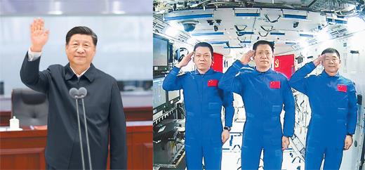 9时40分,习近平起身,走到前方指挥席。聂海胜、刘伯明、汤洪波3名航天员精神饱满,向习近平敬礼。